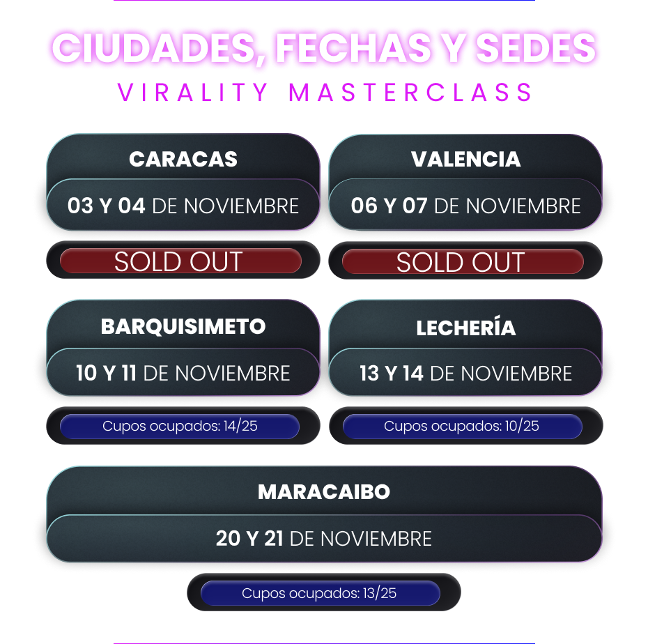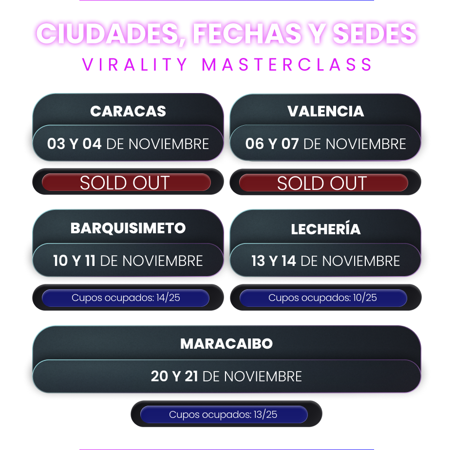 El Virality Masterclass es 100% presencial. No habrá versión online ni grabaciones. Esto es una experiencia en vivo, donde vas a implementar conmigo paso a paso durante 2 días completos.