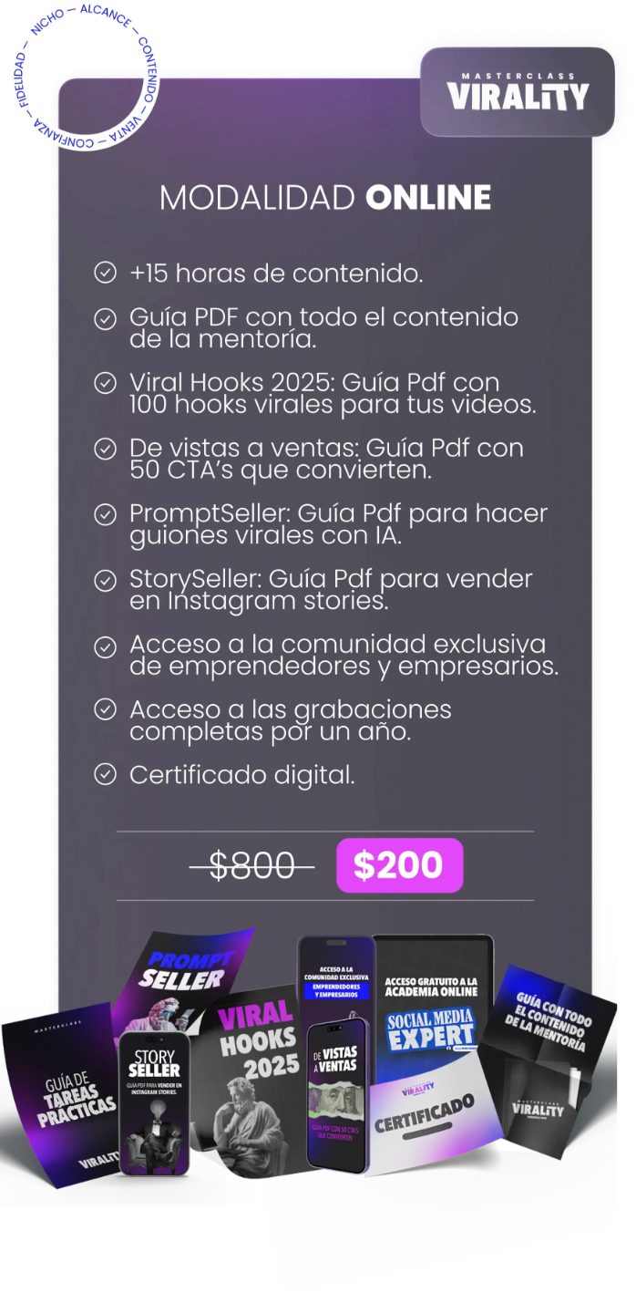 El Virality Masterclass fue presensial pero ahora podras disfrutarla en versión online pregrabada. Esto es una experiencia de +15 Horas, donde vas a implementar conmigo paso a paso.